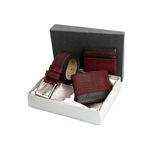 Forentina Erkek Bordo Ekose Kemer Cüzdan Kartvizit Hediye Set PS1089