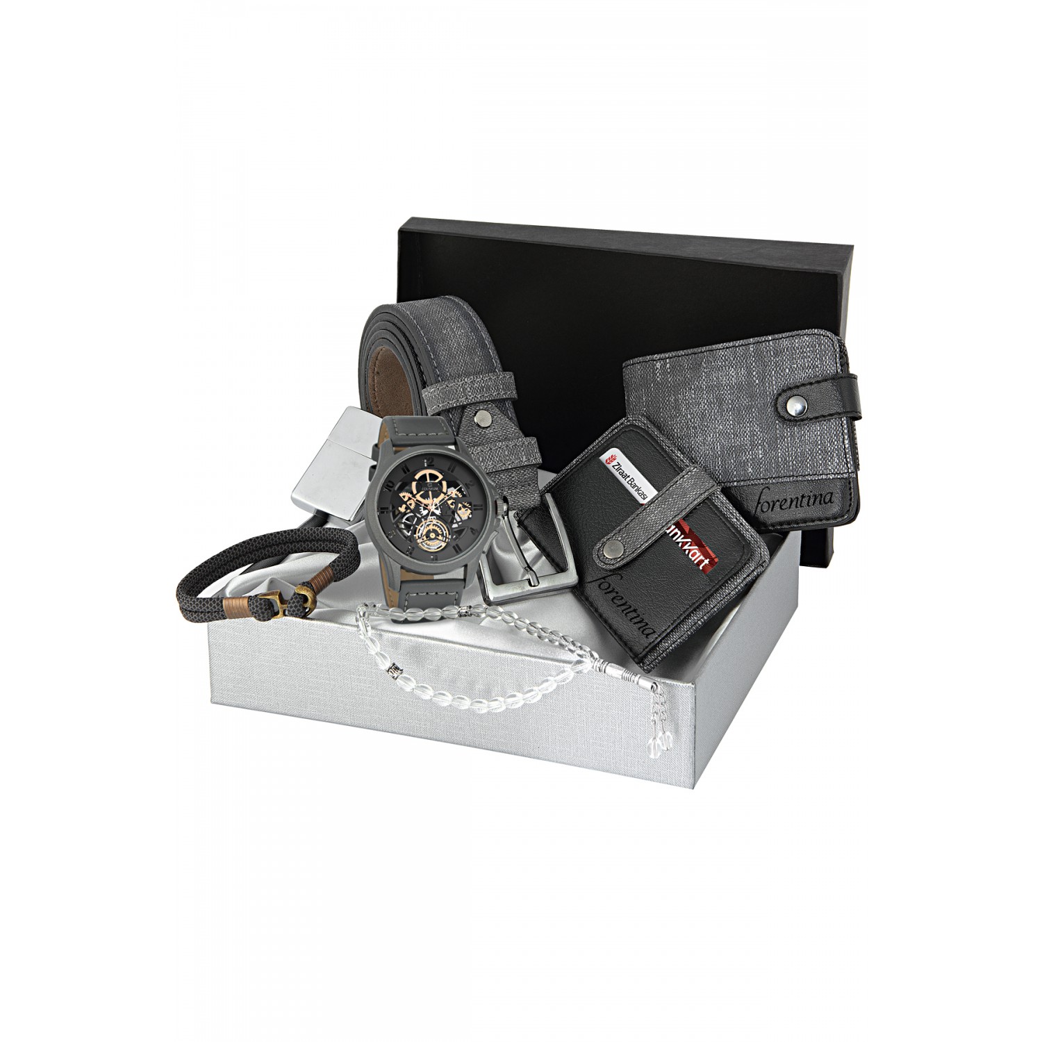Erkek Gri Kemer Cüzdan Kartvizit Tespih Saat Hediye Seti PS1289