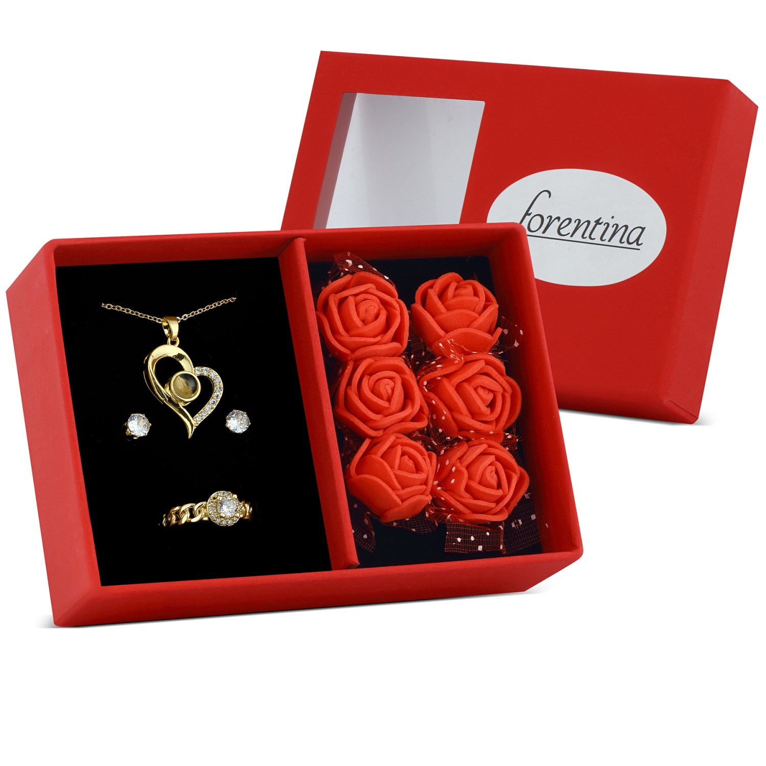 Forentina Altın Kaplama Kalpli Kolye Küpe Yüzük-Kırmızı Güllü Kutuda Hediye Set PS3465