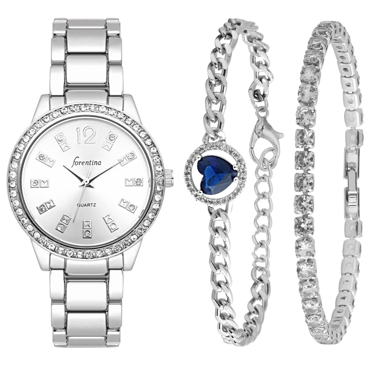 Forentina Bayan Gri Metal Kol Saati Lacivert Taşlı 2li Taşlı Bileklik Kombin Set PS4012