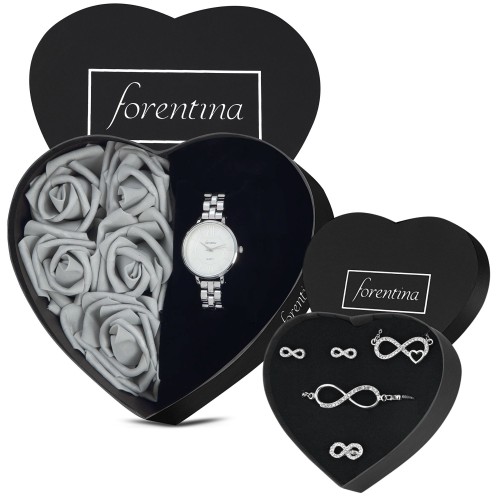 Forentina Gri Güllü Kutuda Gri Metal Kol Saati-Sonsuzluk Kolye Küpe Bileklik Yüzük Takı Seti PS3968