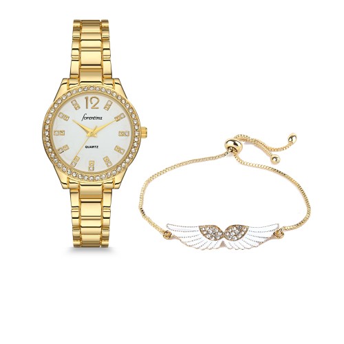 Forentina Bayan Gold Metal Kol Saati-Beyaz Taşlı 2li Bileklik Kombin Set PS4038