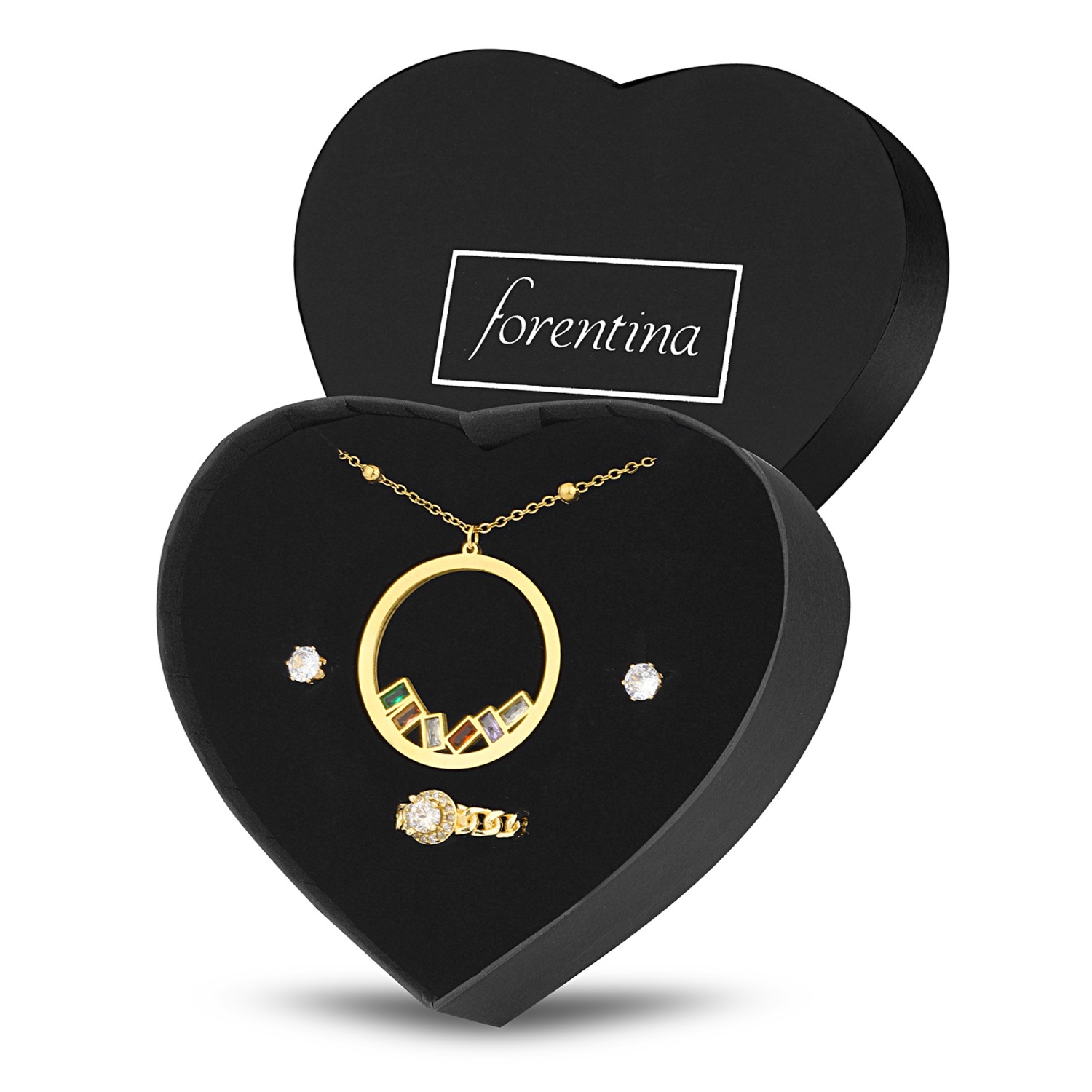 Forentina Kadın Renkli Zirkon Taşlı Kolye Tektaş Küpe Yüzük Saat Takı Seti PS298800TR