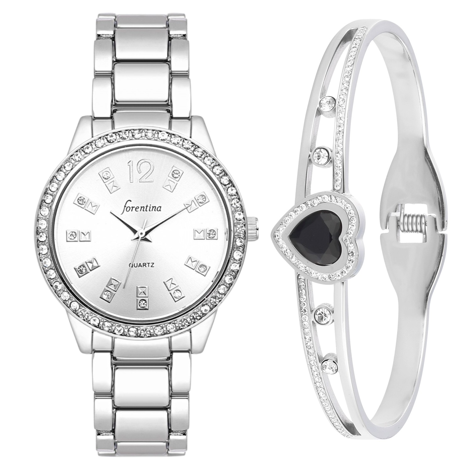 Forentina Bayan Metal Kol Saati - Kalp Siyah Taşlı Bileklik Kombin Set PS3671