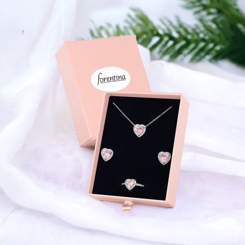 Forentina Gümüş Kaplama Pembe Kalpli Kolye Küpe Yüzük Pembe Kutuda Hediye Set PS3366