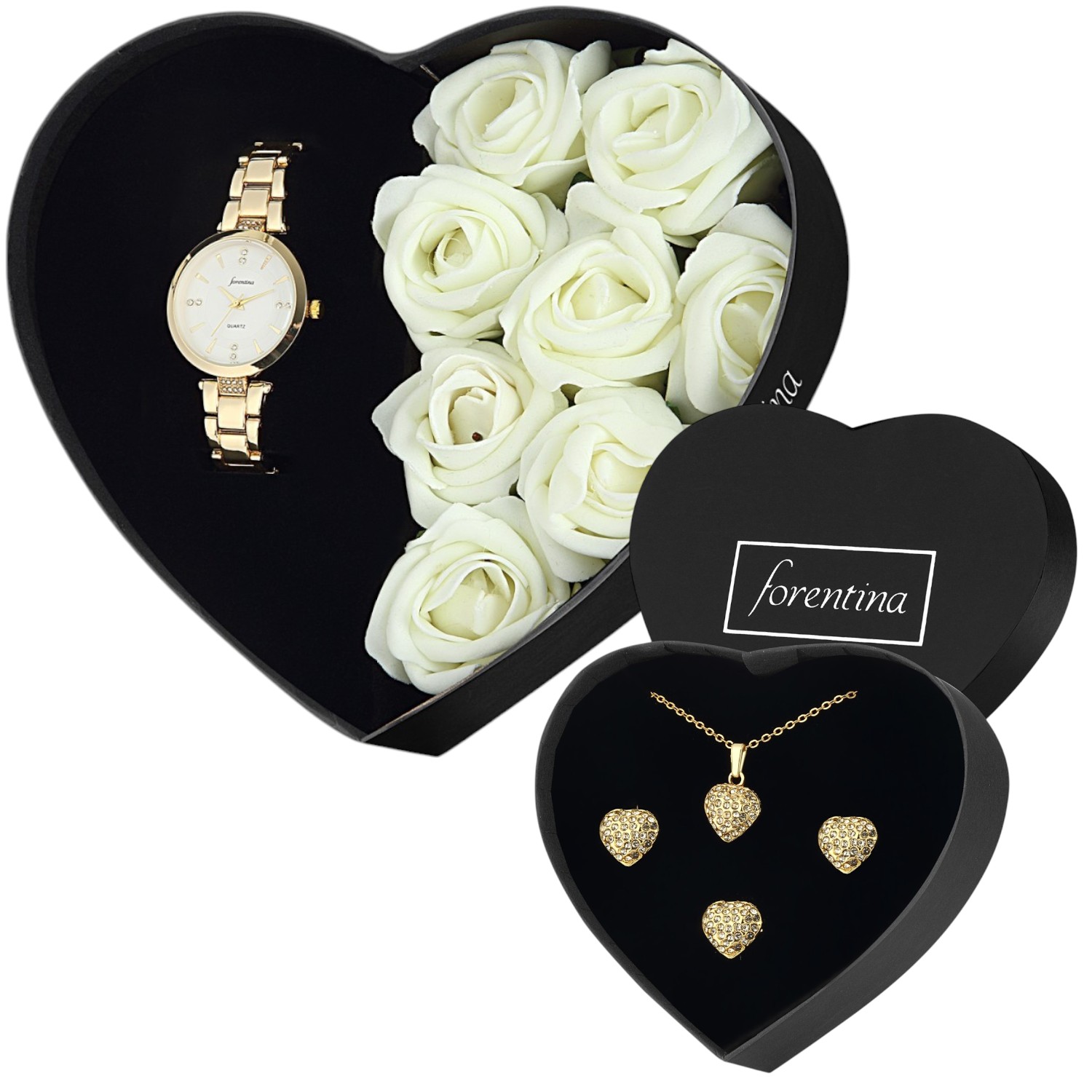 Forentina Beyaz Güllü Kutuda Bayan Gold Metal Kol Saati-Gold Kalpli Kolye Küpe Yüzük Takı Seti PS3951