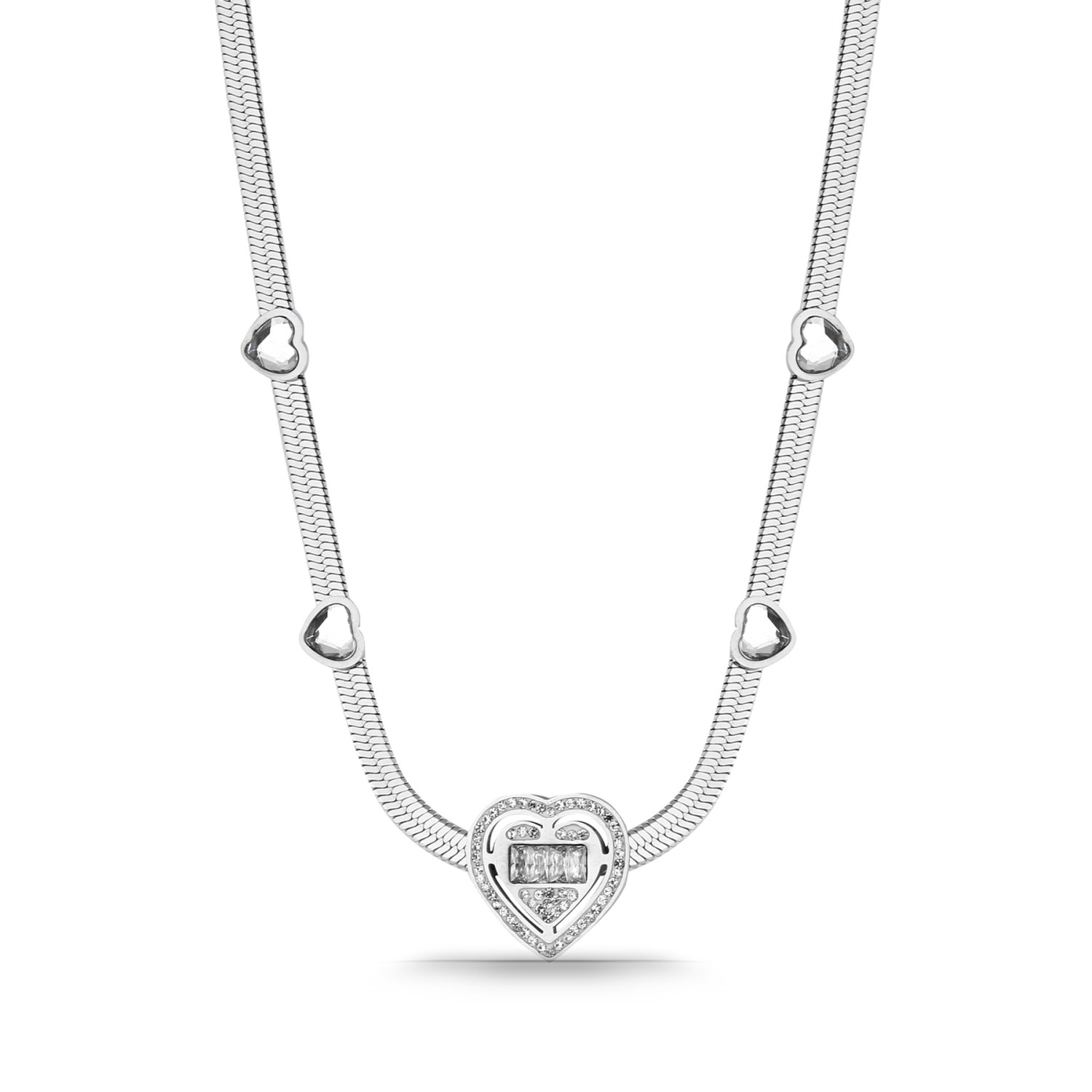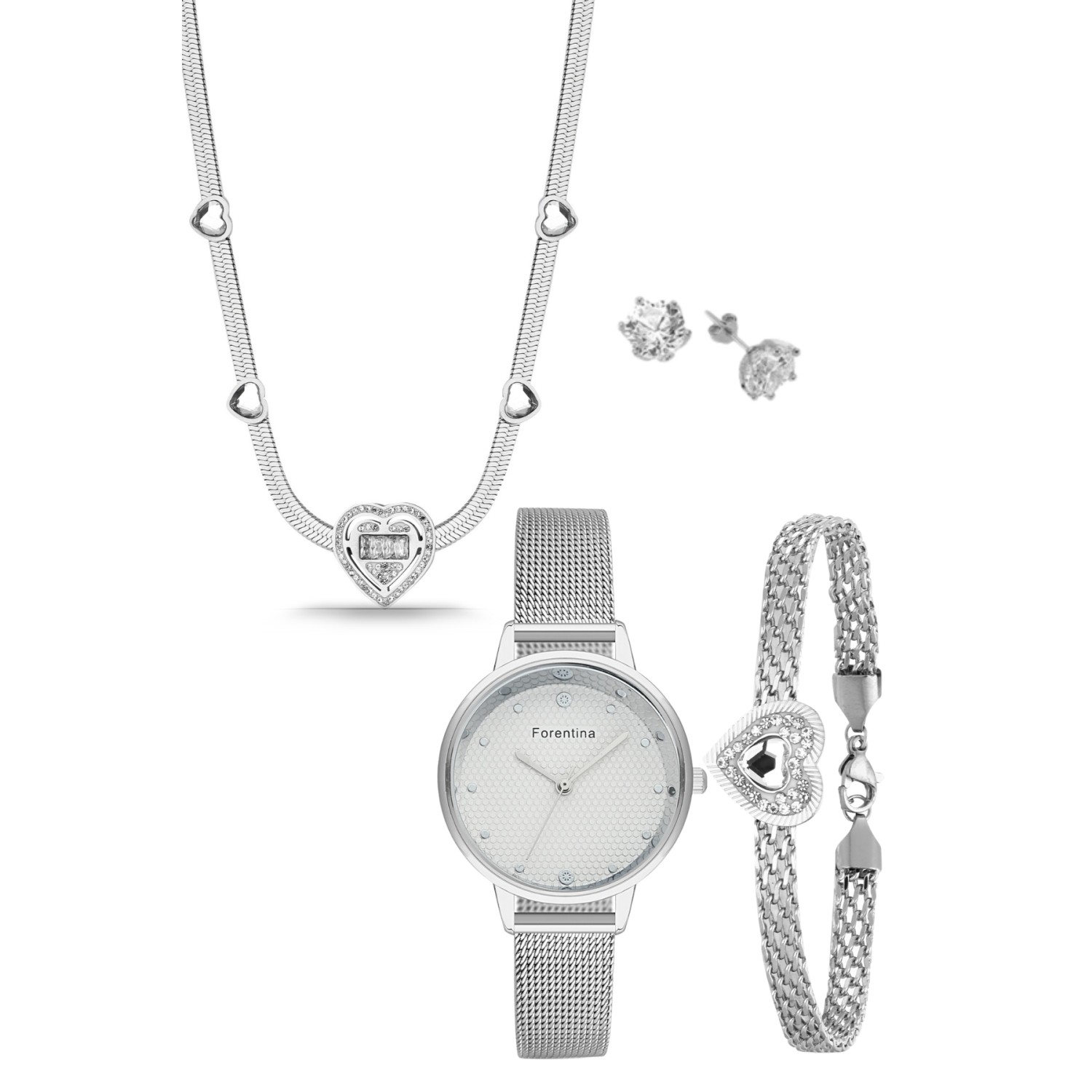 Forentina Gri Yılan Zincir Kalpli Kolye Bileklik Küpe-Saat Kombin PS4117