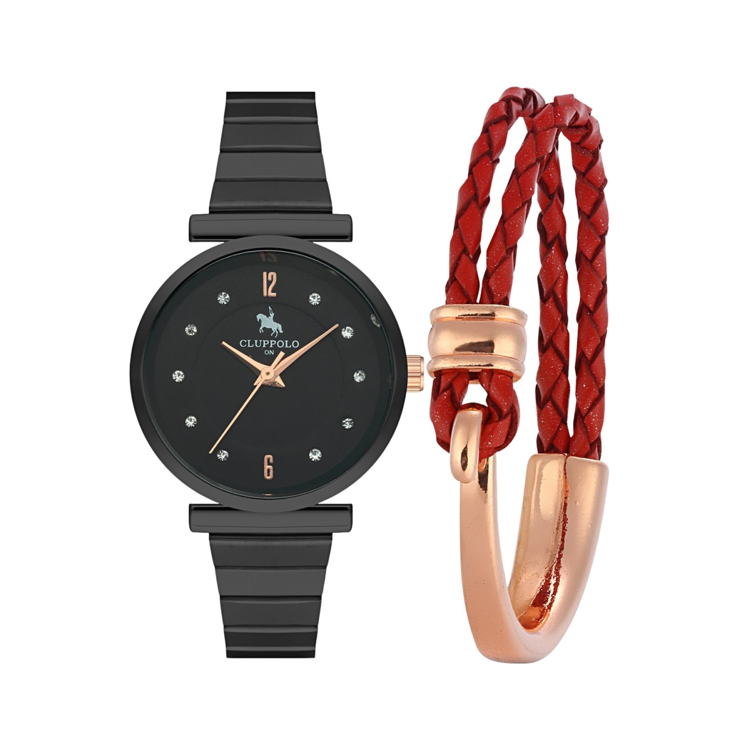 Forentina Bayan Siyah Kol Saati-Kırmızı Deri Bileklik Kombin Set PS4143